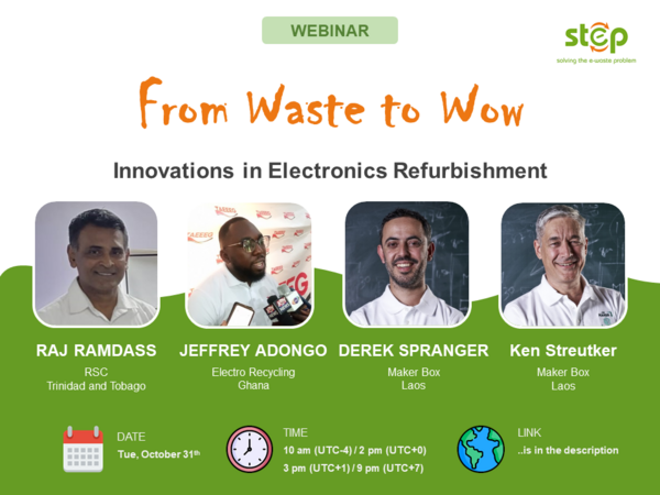 The speakers of the webinar will be Raj Ramdass from Restore A Sense of I Can (RSC) in Trinidad and Tobago, Jeffrey Adongo from Electro Recycling in Ghana, and Derek Spranger and Ken Streutker from MAKERBOX in Laos.